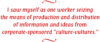 The Gregorian chant that greeted visitors to even the first version of the monastery library belied the fact that I was largely inspired to build the library by going to LA's vibrant punk rock shows and feeling that I was doing the same kind of thing with computers that groups like the Minutemen did to the Rock of the 70's. I saw myself as one worker seizing the means of production and distribution of information and ideas from corporate-sponsored "culture-vultures." I felt like having fun.