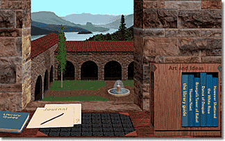 As the cloister fountain gently splashes, relax to the unearthly beauty of a Gregorian chant and enjoy our library's view of the Oregon's Columbia River Gorge. Or browse, on our four-sided revolving bookcase, the library's four collections -- "Art & Ideas," "The American Renaissance," "The Monks' Library," and the "JFK Archives." I'll briefly describe here just three of the CD-ROM's experiments in interactive media.