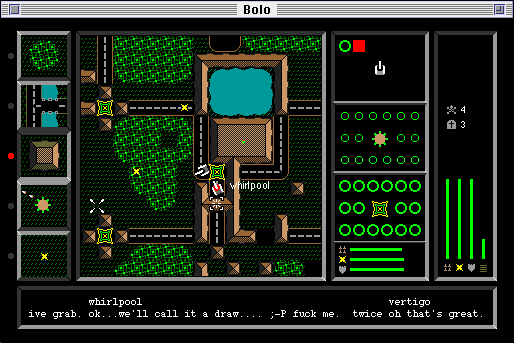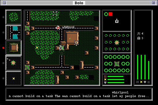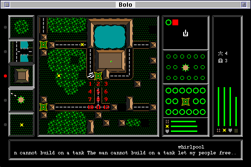 So, then there was nothing else to do except to trap whirlpool somewhere. But, then I thought... "Boy, it would be awfully nice to be able to trap him near his lgm so I can get a nice snapshot." With this in mind, I sat on the base and waited for him to come by again. In the mean time, i laid tarmac on #2 and built walls on #1 and #3, just to see if he would be foolish enough to come sit in front of me on #2. He finally did come by and sat a few squares ahead of me... between #8 and #11. But I left him alone for a minute, just to see what he would do... We sat there and looked at each other for a minute. Finally, he sends a message, "ok...we'll call it a draw...." This was my chance, as soon as I saw that message appear, I dashed forward, sending my man to build a wall on #10, pushed his tank up against the back wall, and quickly built a wall on #12. He squirmed for a second, but I already had his ass nailed... I don't think he realized at this point how bad his situation was... I casually built walls on #7, #9, #4, and #6, and exited across my base. Only afterwards did i build a wall on #5, just for good measure. hehehe
