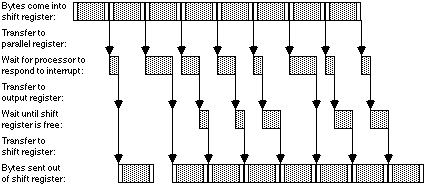 A similar process occurs on the transmitting side. When the first byte is written to the parallel register, it is immediately transferred to the shift register and transmission begins. A second byte can be placed in the parallel register and it will be held there until it is needed. Then, when the shift register becomes empty the byte is transferred across and transmission continues uninterrupted. An interrupt is signalled and the processor then has one character's worth of time to load the parallel register so that it will be ready for when the shift register needs it. Unlike the input register, this is not critical, and if it does not do it on time, then the shift register will just wait until the next character is provided. No error condition will be generated, but of course the serial port will not be transmitting data as fast as it could be[26].