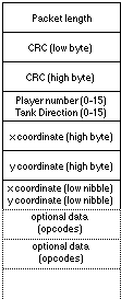 (iv) It was noticed that every group of opcodes sent by a machine started with a `New Player', followed by a tank direction opcode and a tank location opcode. Since every machine knew that these opcodes were due to arrive, in that order, it seemed a waste to actually use a valuable byte of network space to say so. Hence, it could be assumed that `New Player' was going to be followed by the tank's direction and position without actually sending a separate opcode byte for each one. In other words, all that data was being incorporated into the `New Player' opcode itself. It was the extension of this into its logical conclusion which led to the scheme described below.