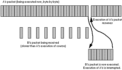 It also means that execution of this packet does not need to start immediately, because it can be safely left lying in memory, knowing that it too will not be overwritten either, because the next packet will be arriving after that one in memory, and so on.