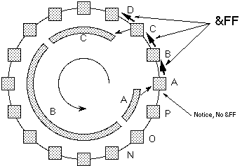 (iii) It then goes into a loop, transmitting a byte repeatedly. This byte is &FF if this machine was transmitting when the ring failed, or still has an unconfirmed packet which it wishes to retransmit, and &00 if it does not with to retransmit. Thus, if in a ring we have 16 stations, imagine: Station A has transmitted a packet which it is halfway through receiving back. Station B transmitted a packet after that, which it hasn't started getting back at all yet. Station C has just started sending its packet and is halfway through transmission: