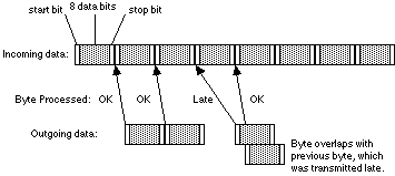 Receive interrupts are occasionally processed late, resulting in brief pauses in the output. They can never be a whole character time late (or an overrun error will occur), and for safety, they should not get too close to this time. The time lost in those brief pauses can never be caught up again, for even if further output characters are transmitted end-to-end without a single pause, the best we can hope for is to just keep pace with the input and not get any later than we already are[27]. Let us assume that interrupts may be disabled for up to, but never more than, half a character time. Then all output will eventually end up half a character late, because once one byte has been processed and sent half a character late (due to a slow interrupt), all following bytes can only be sent in turn after that one, so they will all be half a character late.