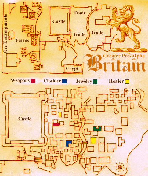 of Danger and Despair. The second map is from the 1996 owo.com website, the original was cut into 2 jpgs. This was the map OSI provided for the pre-alpha testers. As you can see the pre-alpha was a very small portion of the map used today. The map used today was created from scratch, but this pre-alpha map was used as a guide. This explains the differences and similarities found on this map. The map consisted of the city of Britain, farms, orc camps & crypts. Not listed it also included the tower of the evil npc mage Myndon, and the godlands which were outside of the boundary. I will add a very detailed pre-alpha page with screenshots in the future. The third map is from the 1997 owo.com website, it is the original drawing made of the map that would be turned into the cloth map. Lord British : ![]() This is Lord British as he was in