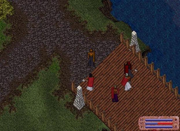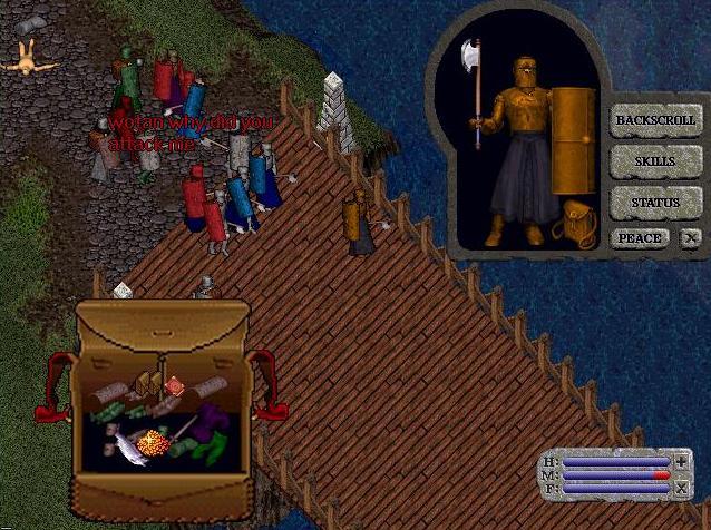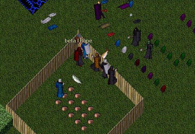 This shot shows many of us at the BOD. I have my paperdoll, backpack, and status scrollbar open. As you can see, my backpack is quite full with offerings I will leave at the Temple for the benefit of the needy. I enjoyed helping out the newer adventurers all throughout the game as DragonSlayer did with me on my first day.