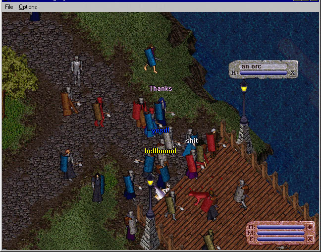 | Compassion at the temple (where dead players respawned) | Yes, an orc with a backpack | The developers having a little fun with us (player-controlled Hellhound) | |||